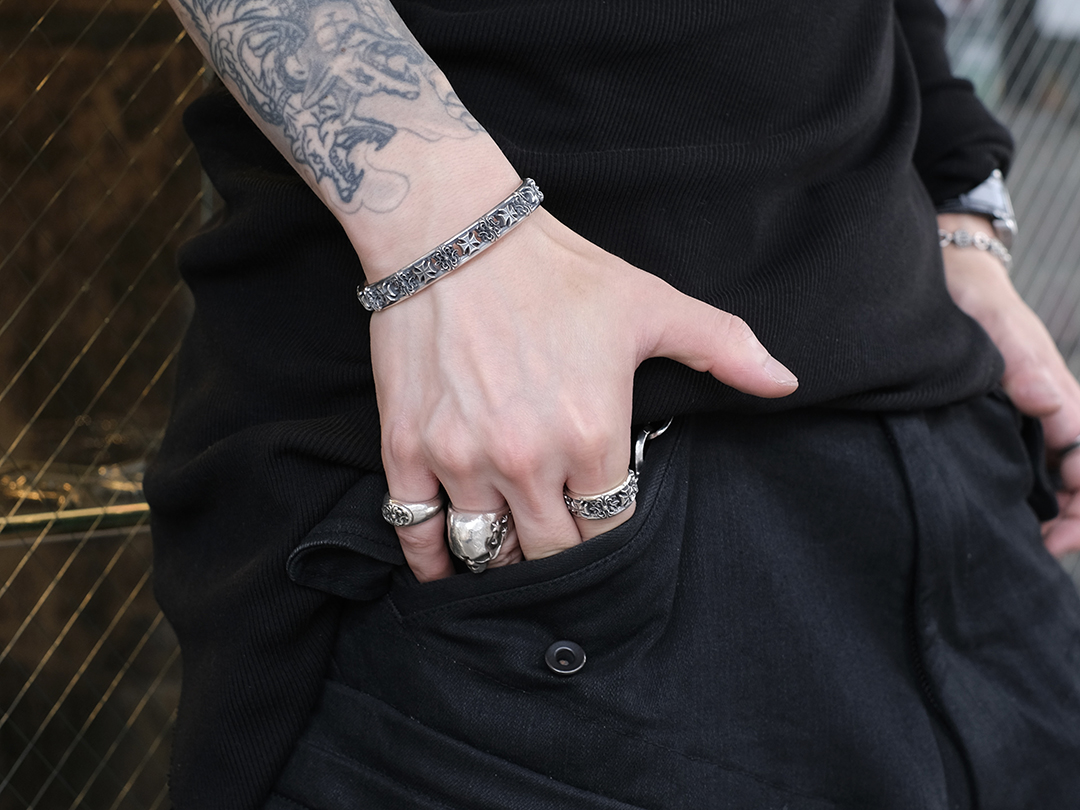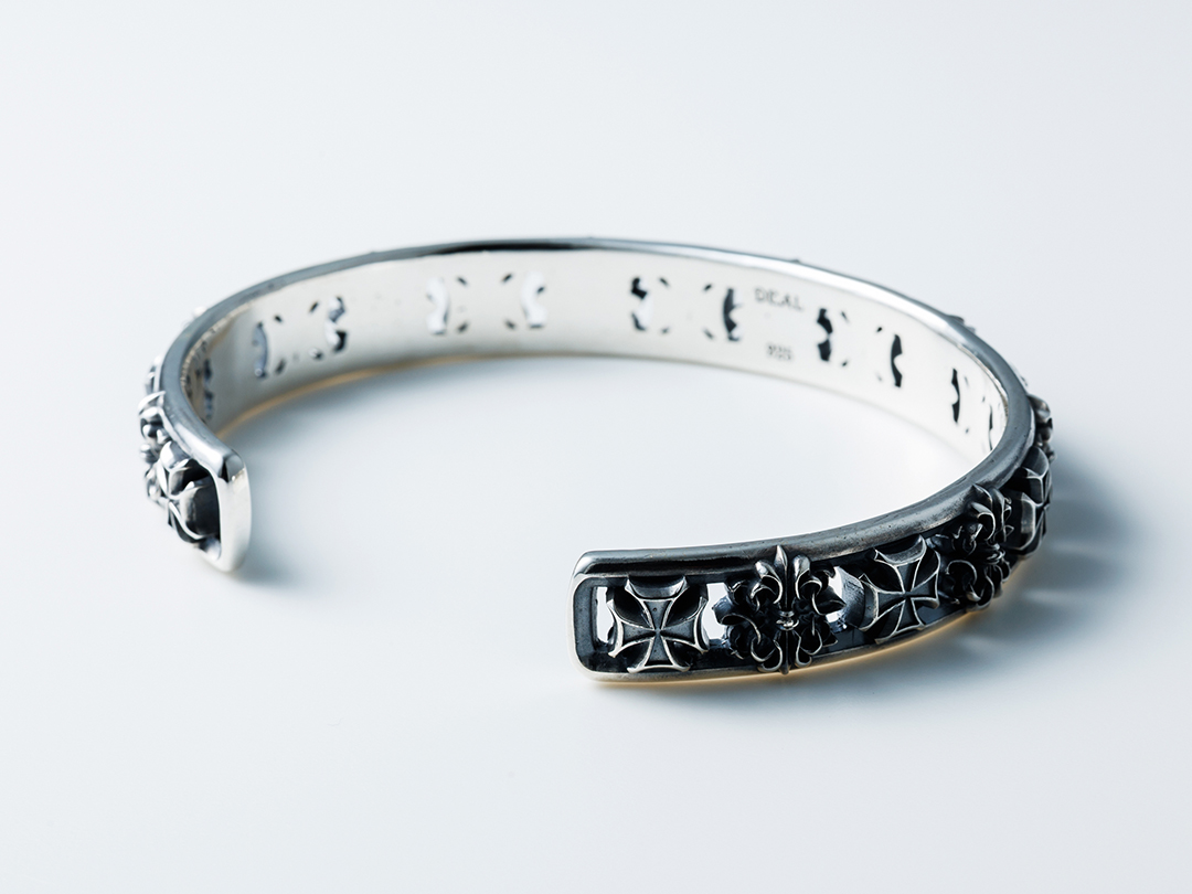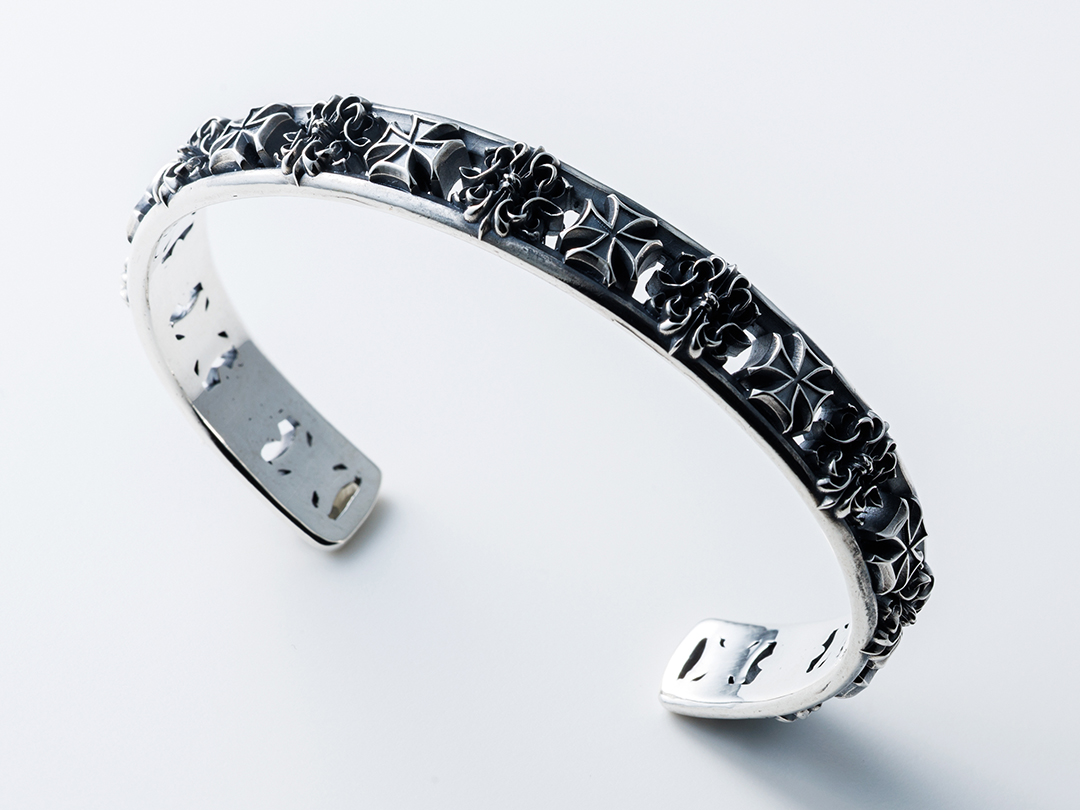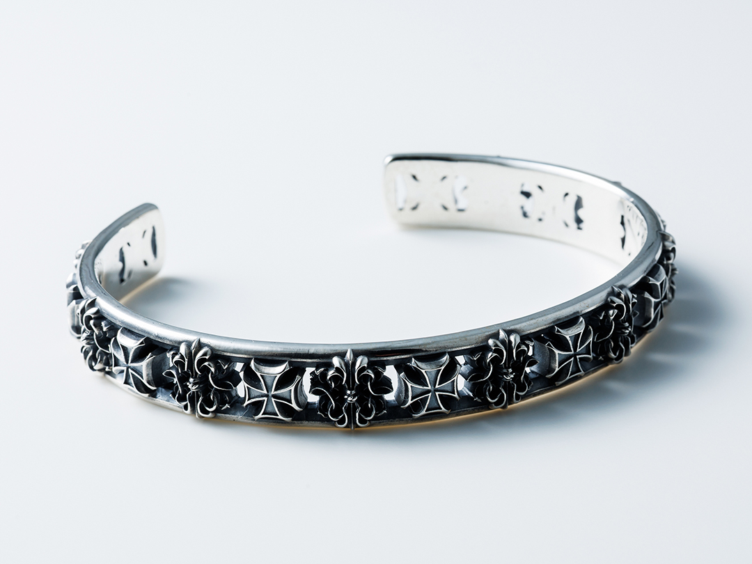ブランドモチーフの代表格であるキングゲートとアイアンクロスを交互に配したバングル。